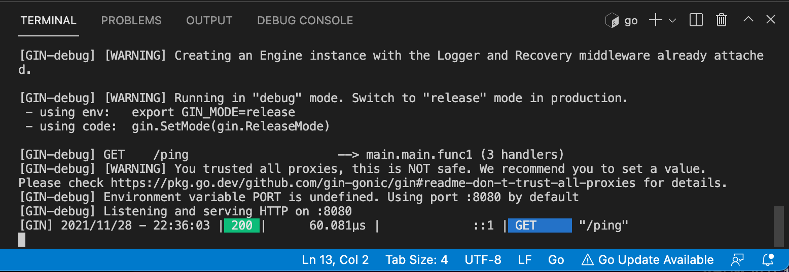 go를 설치하고, 개발환경을 구축한뒤에 gin 패키지를 설치하여 간단한 웹 서버를 구동시켰습니다.