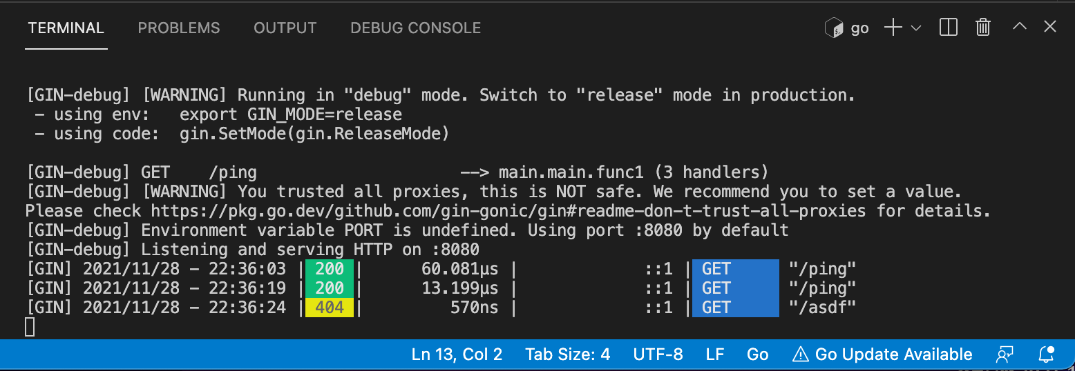 go run main.go를 통해 정상적으로 작동하는지 확인 합니다.