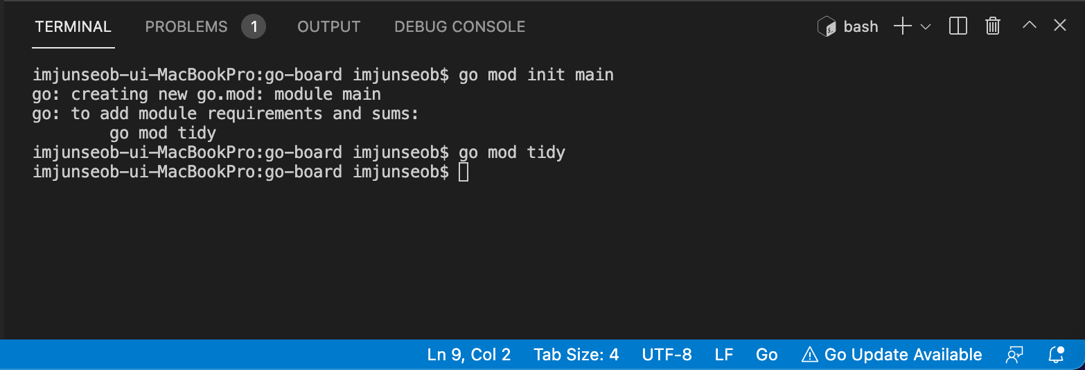 그러면 go mod tidy 를 입력하라고 합니다. 입력해줍니다.
