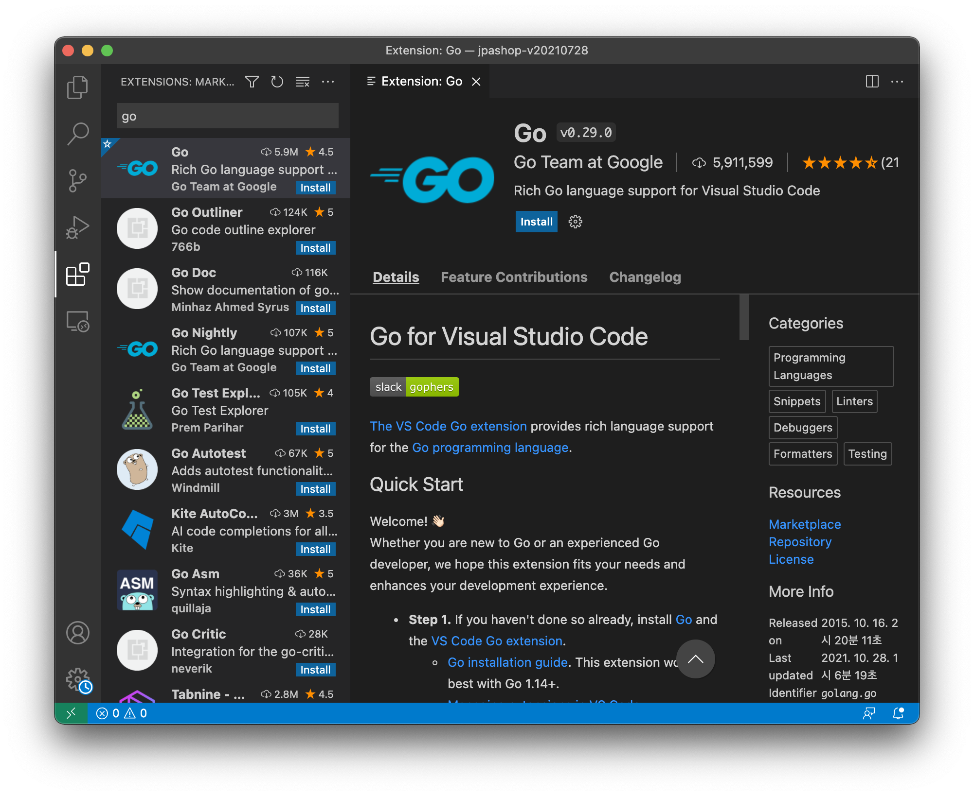 go 관련 extension으로 구글에서 만든 go를 설치해줍니다.