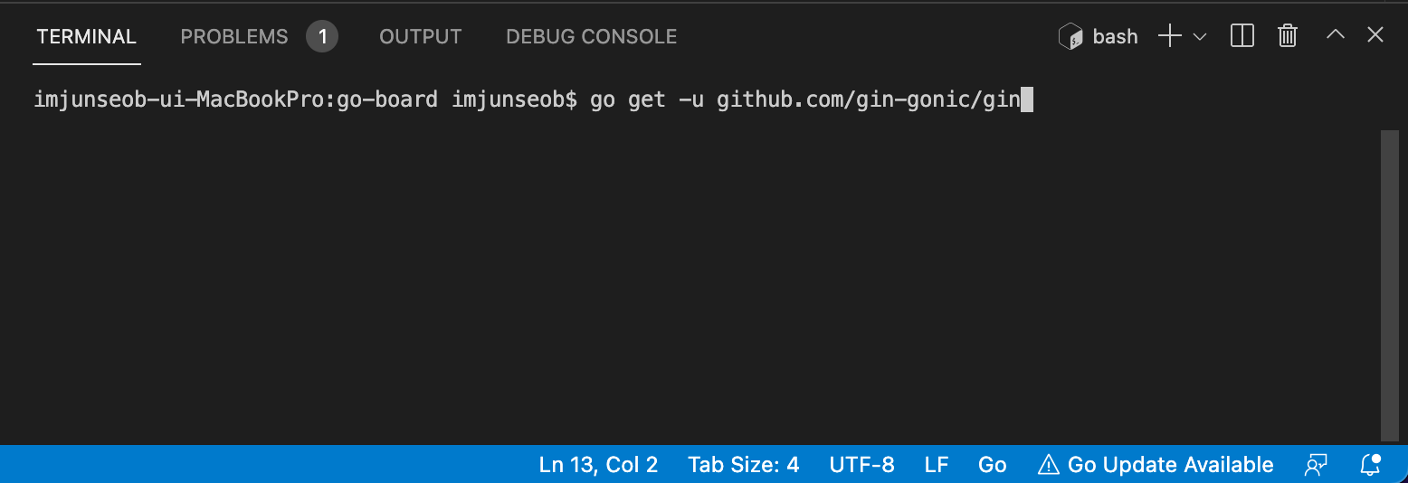 go get -u github.com/gin-gonic/gin를 입력해줍니다.