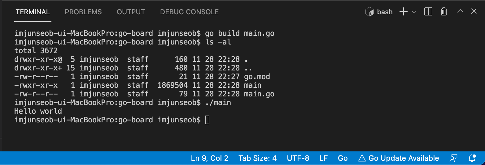 이것을 실행하면 방금전에 go run main.go와 같은 실핼결과를 얻을 수 있습니다.
